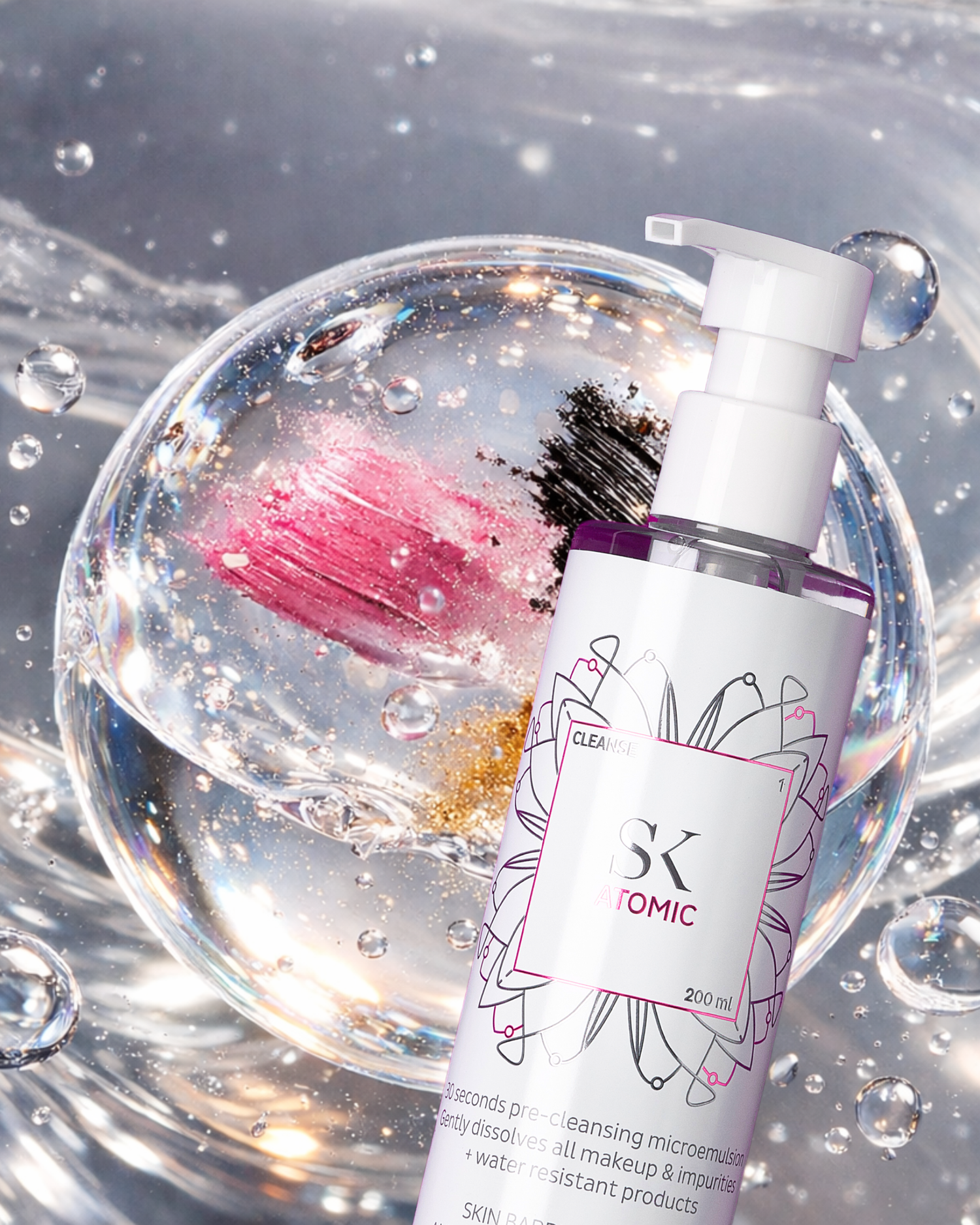 Atomic ist eine minimalistische Mikroemulsion für den ersten Reinigungsschritt (Pre-Cleanse), speziell entwickelt für empfindliche und feuchtigkeitsarme Haut.