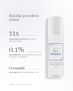 Skintegra Retiron 0.1 je napredni tretman za njegu kože s 0.1% enkapsuliranog retinala koji pruža vidljive rezultate u borbi protiv preuranjenog starenja i neujednačenog tena. Osmišljen za korisnike koji su već upoznati s retinoidima i žele intenzivniji tretman, Retiron 0.1 kombinira retinal s njegujućim sastojcima poput niacinamida, ceramida, antioksidansa i madekasozida.